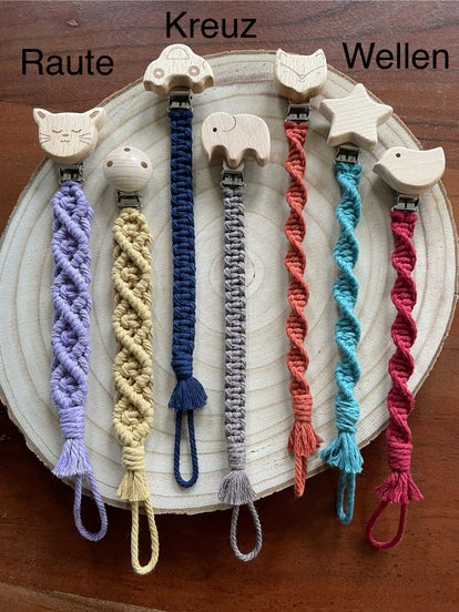 Diese liebevoll handgefertigten Nuggiketten aus Makramee sind ein praktisches und stilvolles Accessoire für dein Baby. Mit einem Holzclip in runder oder motiver Gestaltung lassen sie sich bequem an der Kleidung befestigen. Für die Sicherheit ist die Länge auf maximal 22 cm begrenzt, sodass sie angenehm und sicher für dein Kind sind. Ein schöner und funktionaler Begleiter für unterwegs!