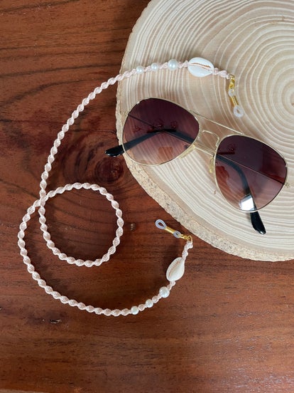 Mit gewachstem Makramee-Garn, liebevoll mit Perlen und Muscheln verziert, verbindet diese Brillenkette stilvollen Boho-Chic mit nachhaltigem Design. Perfekt, um deine Sonnenbrille auf elegante und einzigartige Weise zu tragen!